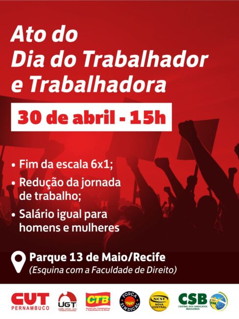 Movimentos sociais das capitais de Recife, Belo Horizonte, Fortaleza, Teresina, São Paulo e Rio de Janeiro já confirmaram os locais de concentração das atividades do 1º de Maio, Dia Internacional dos Trabalhadores. Além de festejar a trajetória da luta de classe, os trabalhadores irão às ruas para pressionar o Congresso Nacional pela aprovação da redução da jornada de trabalho sem perda de direitos e fim da escala 6×1.